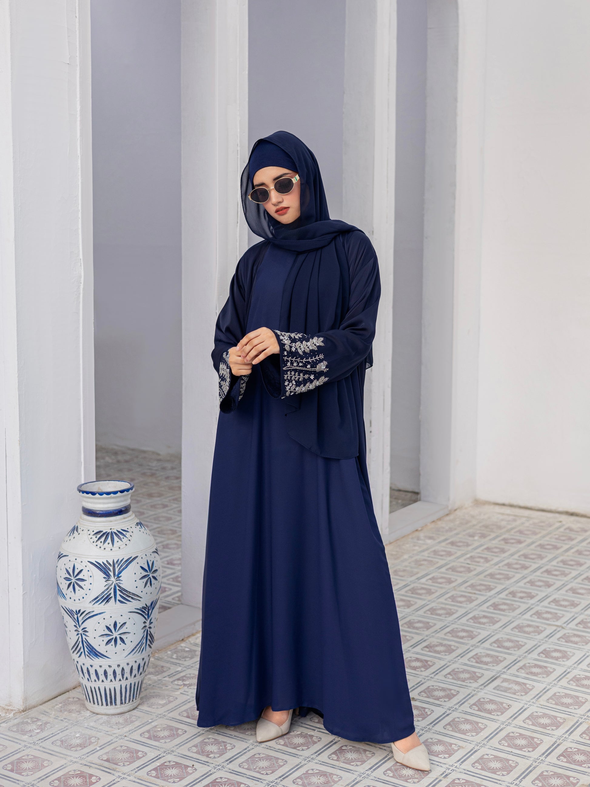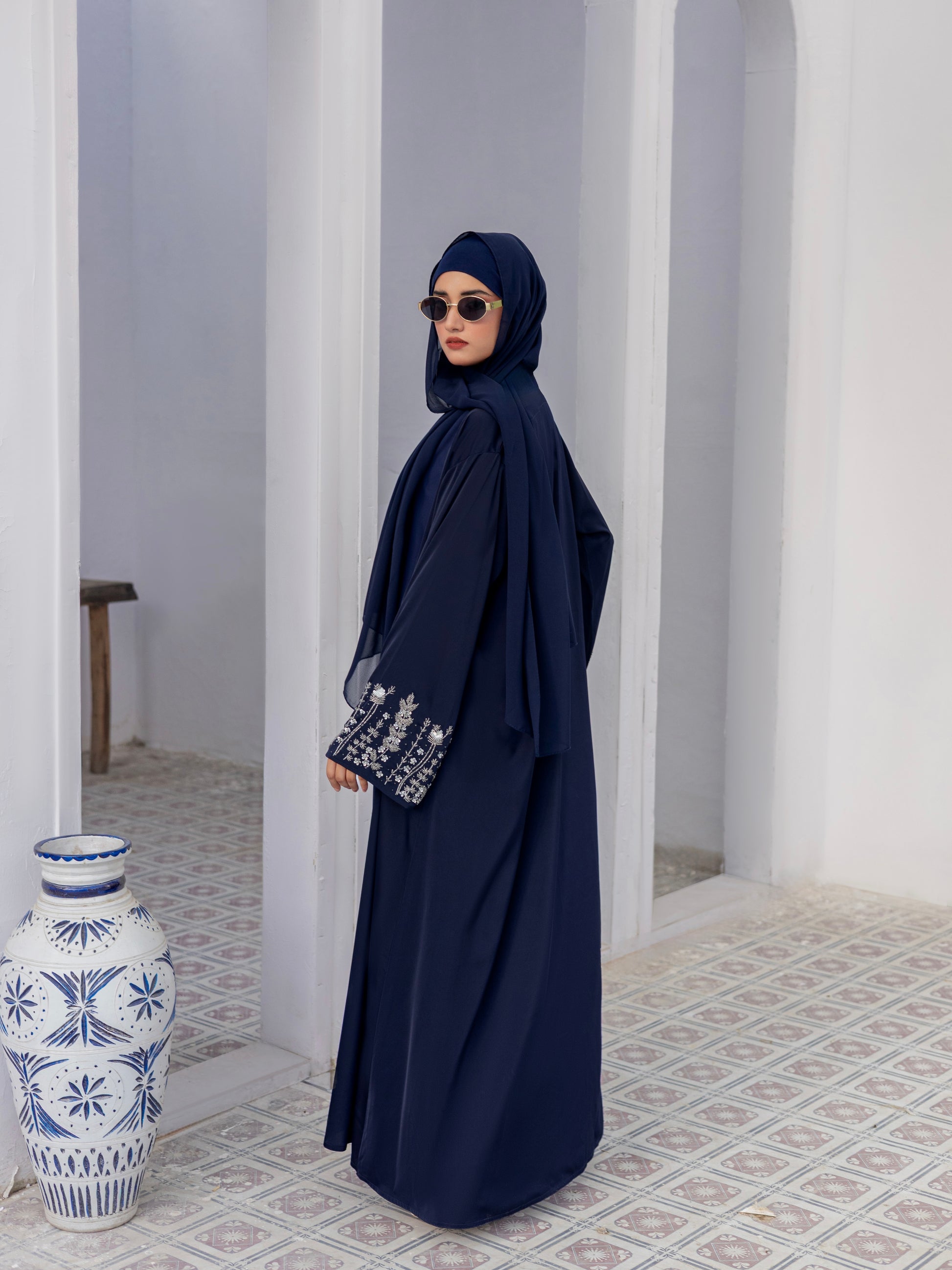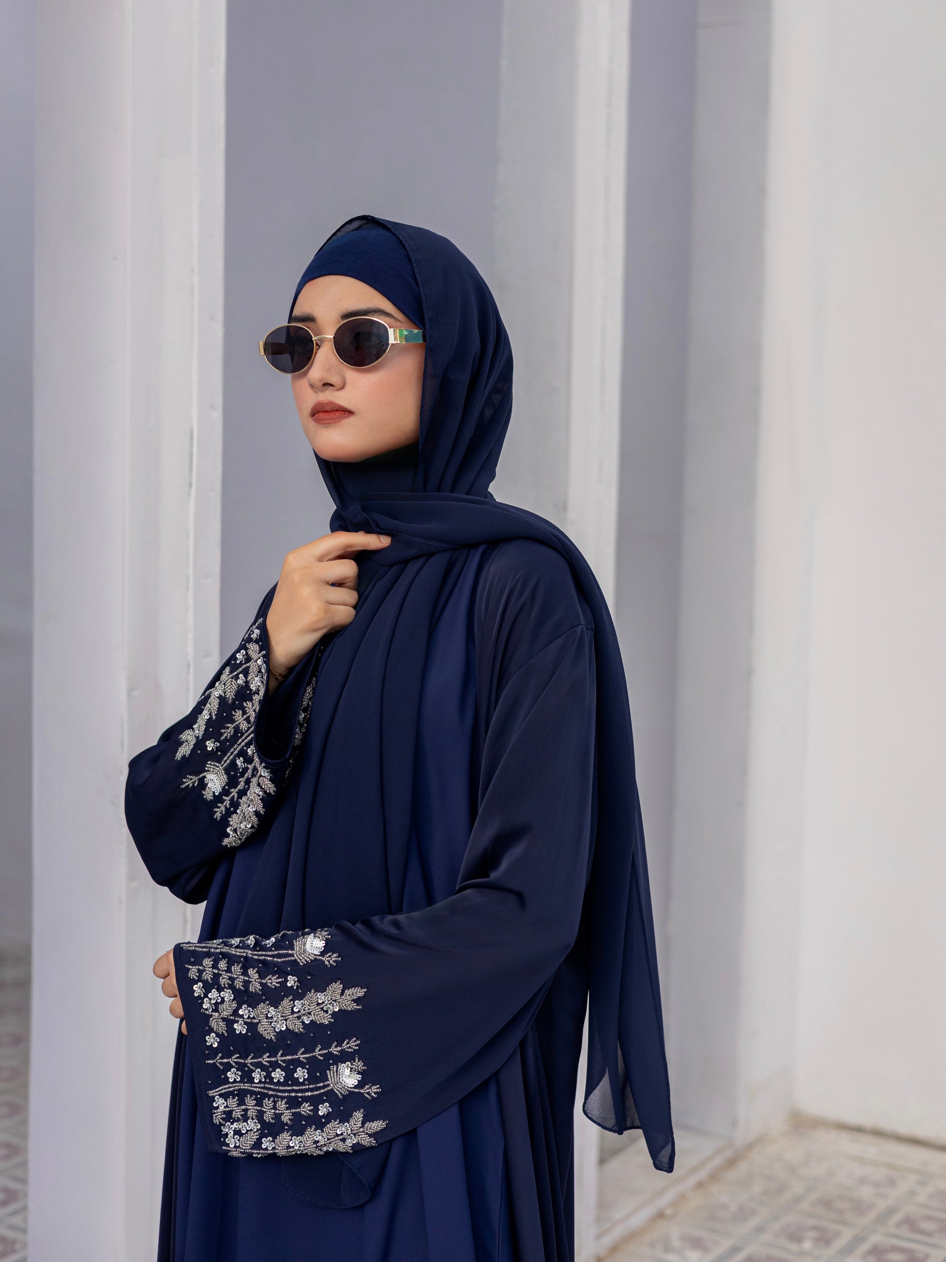 Experience luxury with our royal blue two-layered abaya, crafted from premium shiny fabric and adorned with detailed silver handwork. A perfect fusion of elegance and sophistication for the modern woman.